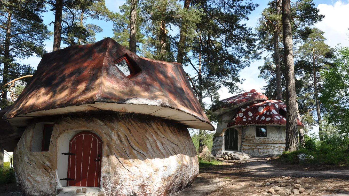 Entlang des Göta-Kanals gibt es viele verschiedene Arten von Unterkünften, aber die Frage ist, ob man irgendwo anders in einem Baumstumpf oder einem Pilz wohnen kann? Das können Sie hier tun.